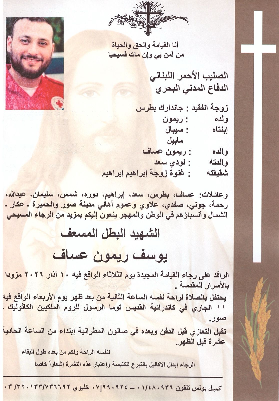 "ينعي الصليب الأحمر اللبناني المسعف يوسف عساف، الذي استشهد متأثراً بجروحه التي أصيب بها أثناء تأدية واجبه الإنساني في خدمة الناس وإنقاذ الأرواح. وقد كان في عداد المسعفين الذين هبوا لإغاثة ضحايا العمليات العدائية حين تم استهداف موقع في بلدة مجدل زون - صور، بتاريخ 9 آذار.