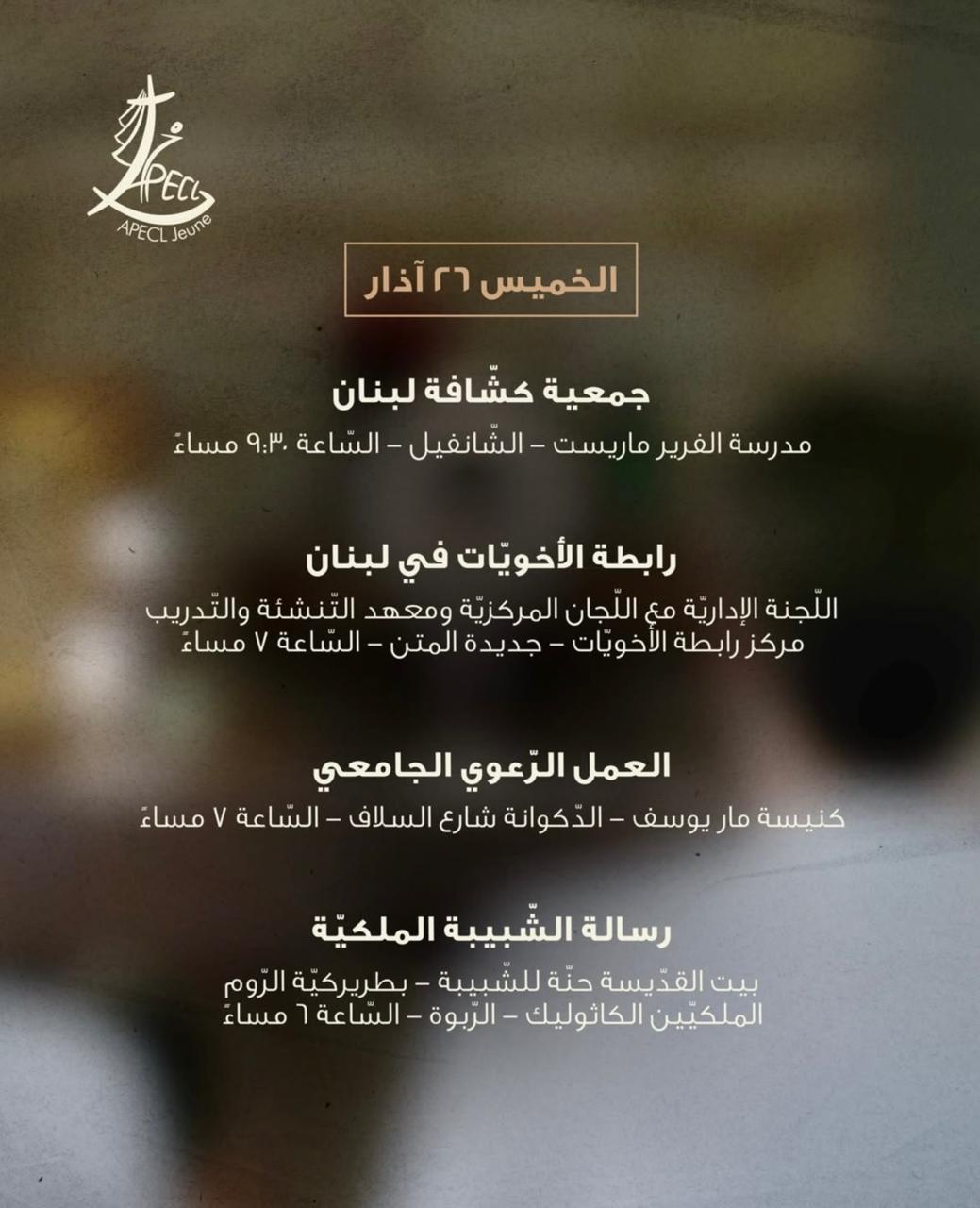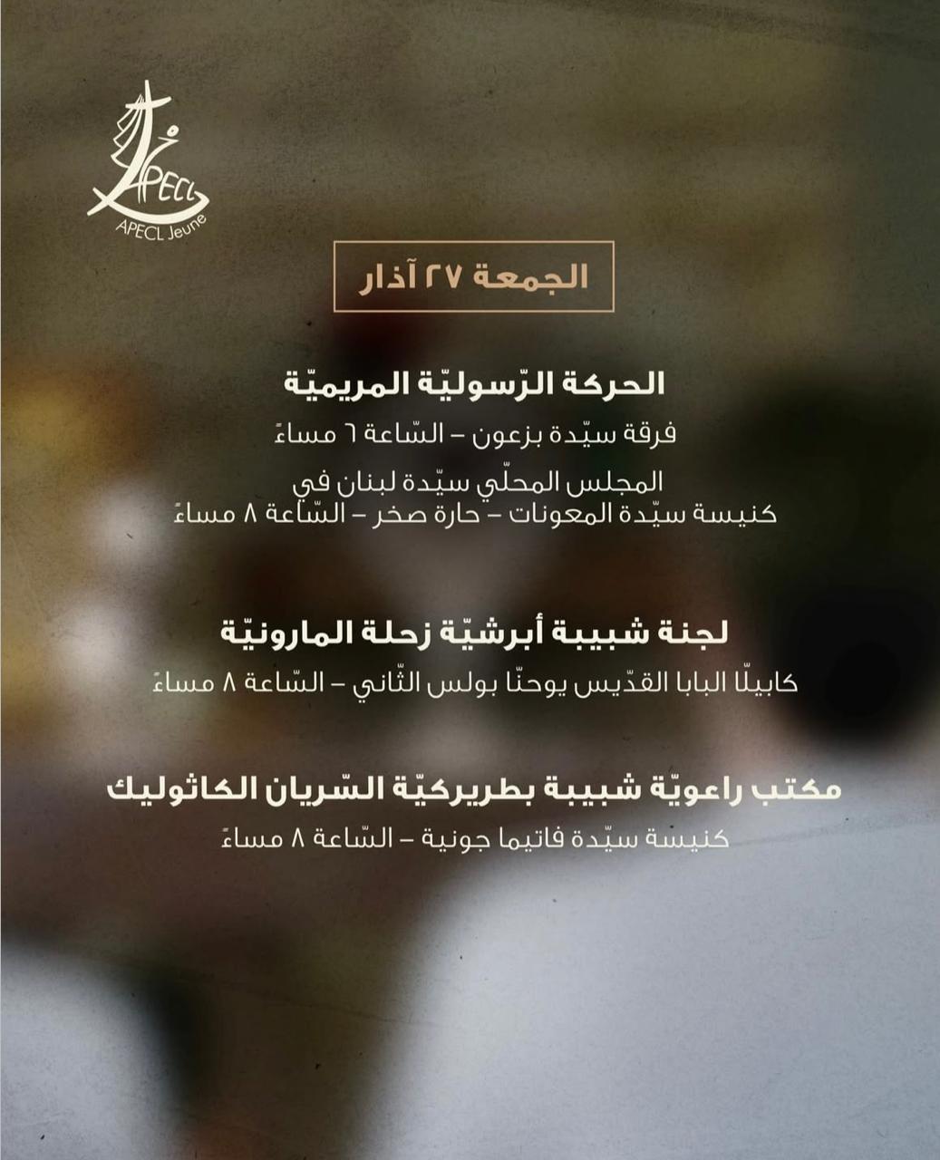 دعت اللجنة الوطنية لراعوية الشبيبة في الكنائس الكاثوليكية في لبنان (APECL Jeune) جميع المجموعات والرعايا والجمعيات الشبيبية إلى المشاركة في تنظيم ساعات صلاة وسجود أمام القربان المقدّس، طلبًا للسلام في لبنان والعالم، وذلك في 26 و27 و28 آذار.