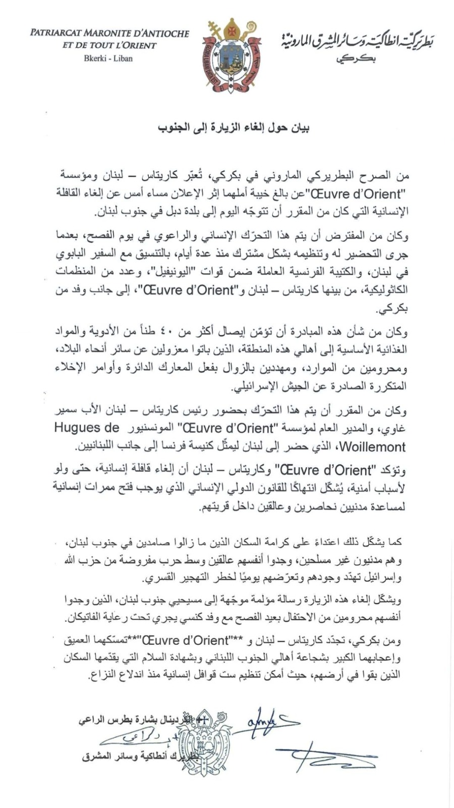 "من الصرح البطريركي الماروني في بكركي، تُعبّر كاريتاس - لبنان ومؤسسة "Oeuvre d'Orient" عن بالغ خيبة أملهما إثر الإعلان مساء أمس عن إلغاء القافلة الإنسانية التي كان من المقرر أن تتوجّه اليوم إلى بلدة دبل في جنوب لبنان.