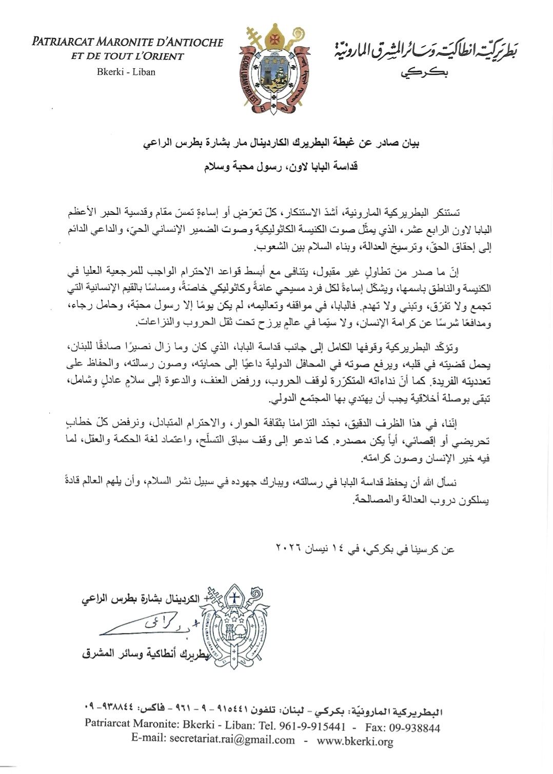 "تستنكر البطريركية المارونية، أشدّ الاستنكار، كلّ تعرّضٍ أو إساءةٍ تمسّ مقام وقدسية الحبر الأعظم البابا لاون الرابع عشر، الذي يمثّل صوت الكنيسة الكاثوليكية وصوت الضمير الإنساني الحيّ، والداعي الدائم إلى إحقاق الحقّ، وترسيخ العدالة، وبناء السلام بين الشعوب.