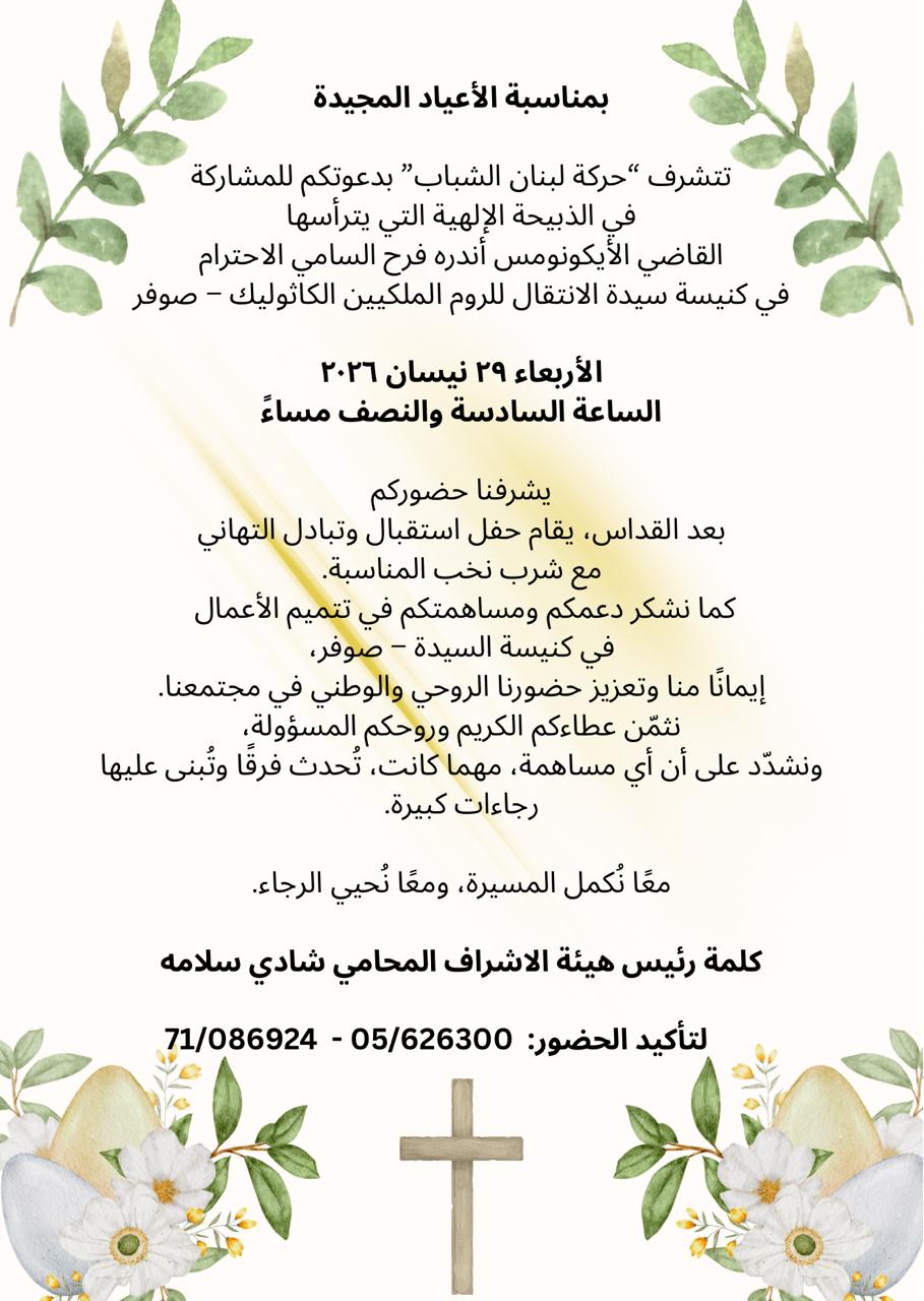 تدعو "حركة لبنان الشباب" المؤمنين إلى المشاركة في الذبيحة الإلهية لمناسبة الأعياد المجيدة، التي يترأسها القاضي الأيكونوموس أندره فرح، وذلك في كنيسة سيدة الانتقال للروم الملكيين الكاثوليك – صوفر، يوم الأربعاء 29 نيسان 2026 عند الساعة السادسة والنصف مساءً.