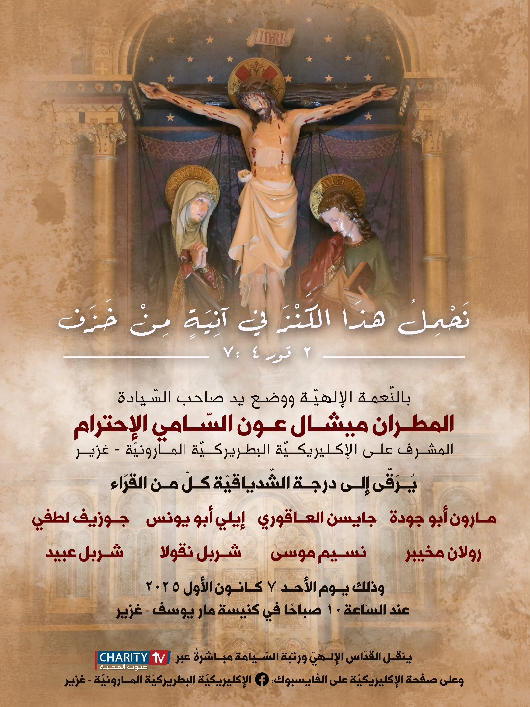بالنّعمة الإلهيّة ووضع يد سيادة المطران ميشال عون، راعي أبرشية جبيل المارونية والمشرف على الإكليركية البطريركية المارونية في غزير، يُرقّى إلى درجة الشدياقية كلّ من القرّاء مارون أبو جودة، جايسن العاقوري، إيلي أبو يونس، جوزيف لطفي، رولان مخيبر، نسيم موسى، شربل نقولا وشربل عبيد، وذلك يوم الأحد 7 كانون الأول 2025 في كنيسة مار يوسف - غزير عند الساعة العاشرة صباحًا.