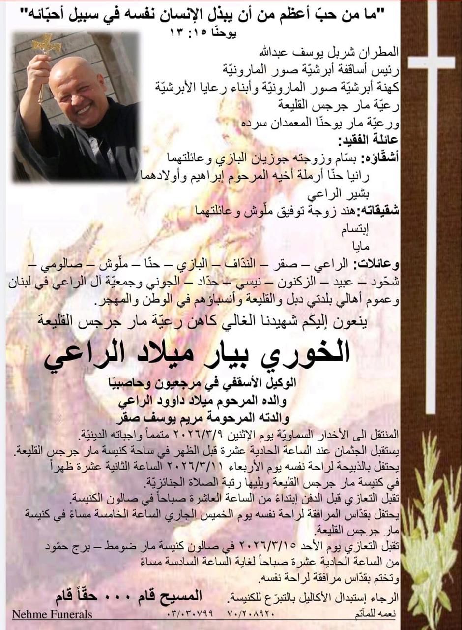 نرفع الصلاة من أجل راحة نفسه، مع الدعاء بأن يعمّ السلام في لبنان وتتوقف الحرب، وأن يسود الهدوء في البلاد، متحدين بالصلاة مع قداسة الحبر الأعظم من أجل إحلال السلام في العالم ونزع السلاح.