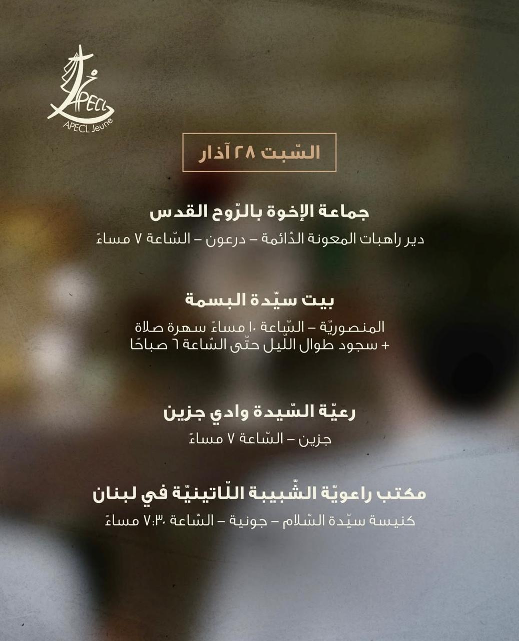 دعت اللجنة الوطنية لراعوية الشبيبة في الكنائس الكاثوليكية في لبنان (APECL Jeune) جميع المجموعات والرعايا والجمعيات الشبيبية إلى المشاركة في تنظيم ساعات صلاة وسجود أمام القربان المقدّس، طلبًا للسلام في لبنان والعالم، وذلك في 26 و27 و28 آذار.
