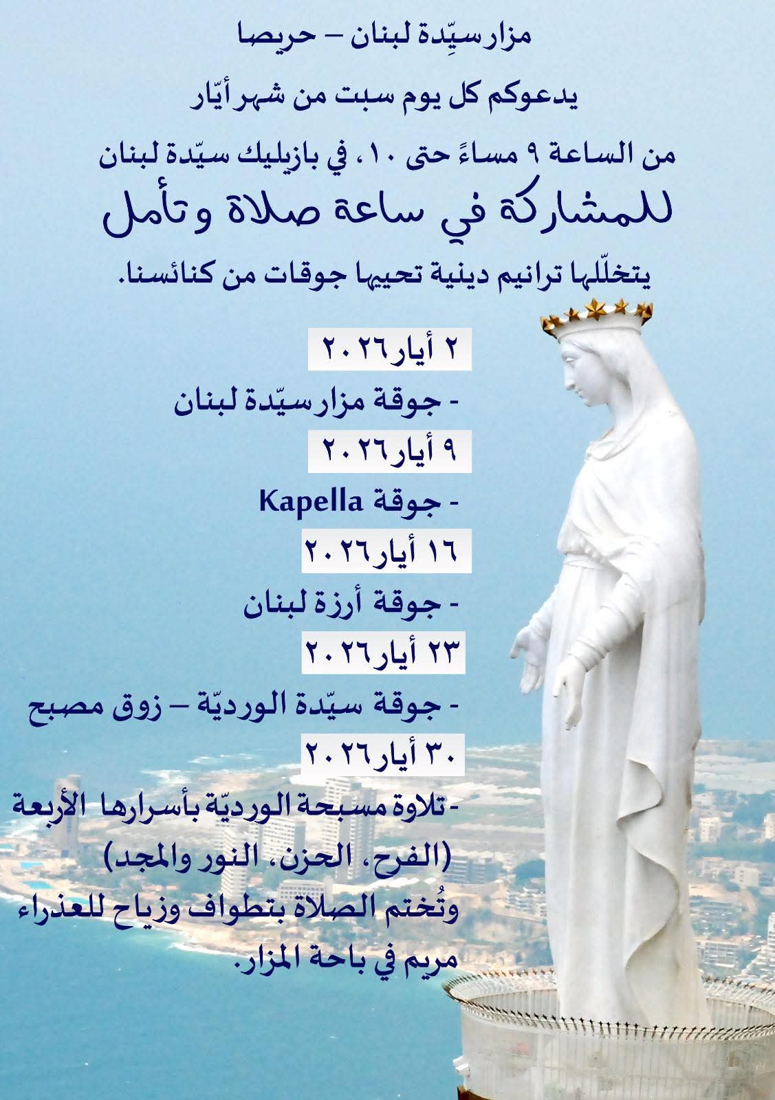 دعا مزار سيدة لبنان – حريصا المؤمنين إلى المشاركة في ساعة صلاة وتأمل تُقام كل يوم سبت من شهر أيار، من الساعة التاسعة مساءً حتى العاشرة، في بازيليك سيدة لبنان.