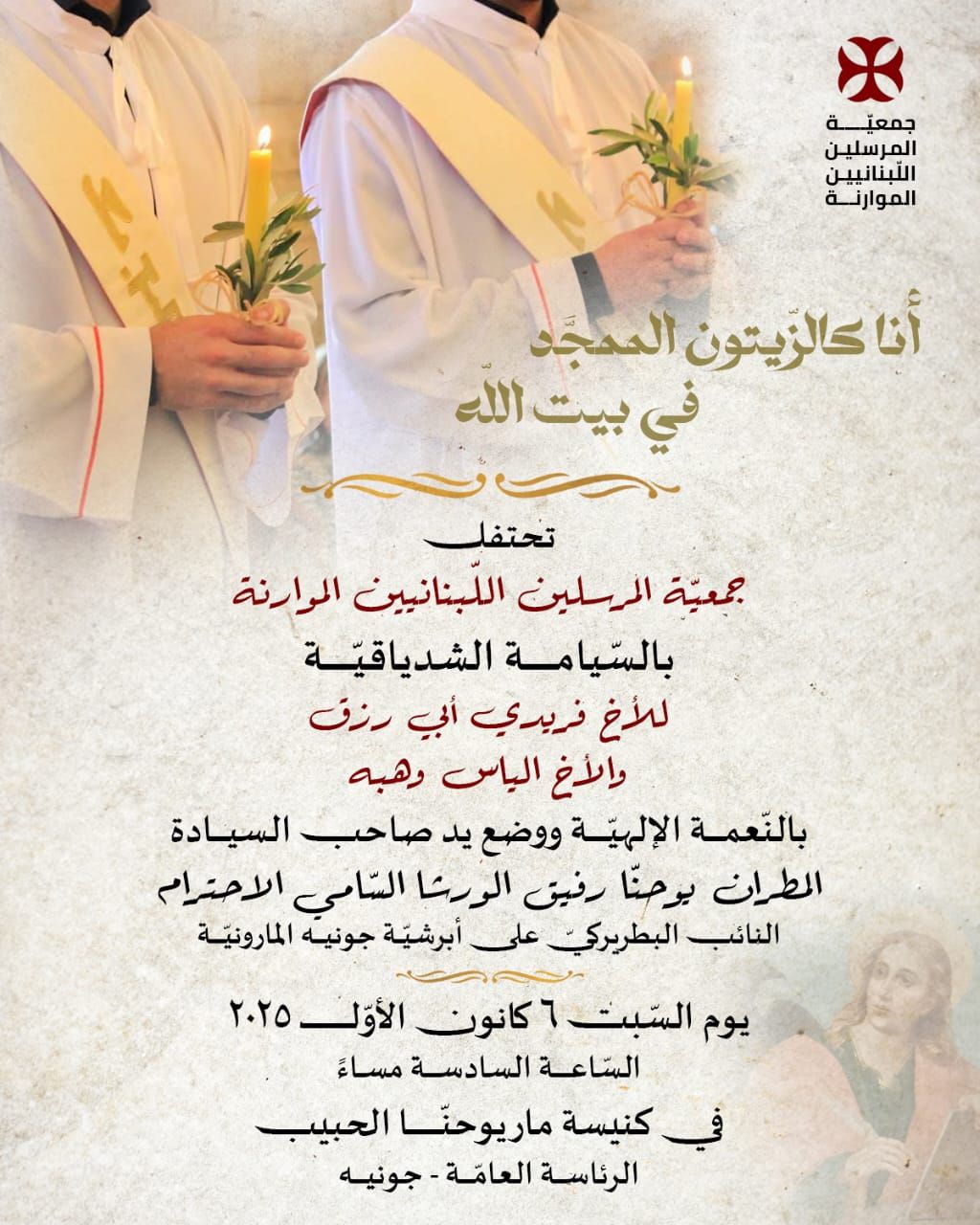 بالنّعمة الإلهيّة ووضع يد سيادة المطران يوحنّا رفيق الورشا، النائب البطريركي على أبرشية جونيه المارونية، تحتفل جمعيّة المرسلين اللبنانيين الموارنة بالسيامة الشدياقيّة للأخ فريدي أبي رزق والأخ الياس وهبه، وذلك يوم السبت 6 كانون الأول 2025 الساعة السادسة مساءً في كنيسة مار يوحنّا الحبيب - مقر الرئاسة العامّة لجمعيّة المرسلين اللبنانيين الموارنة في جونيه.