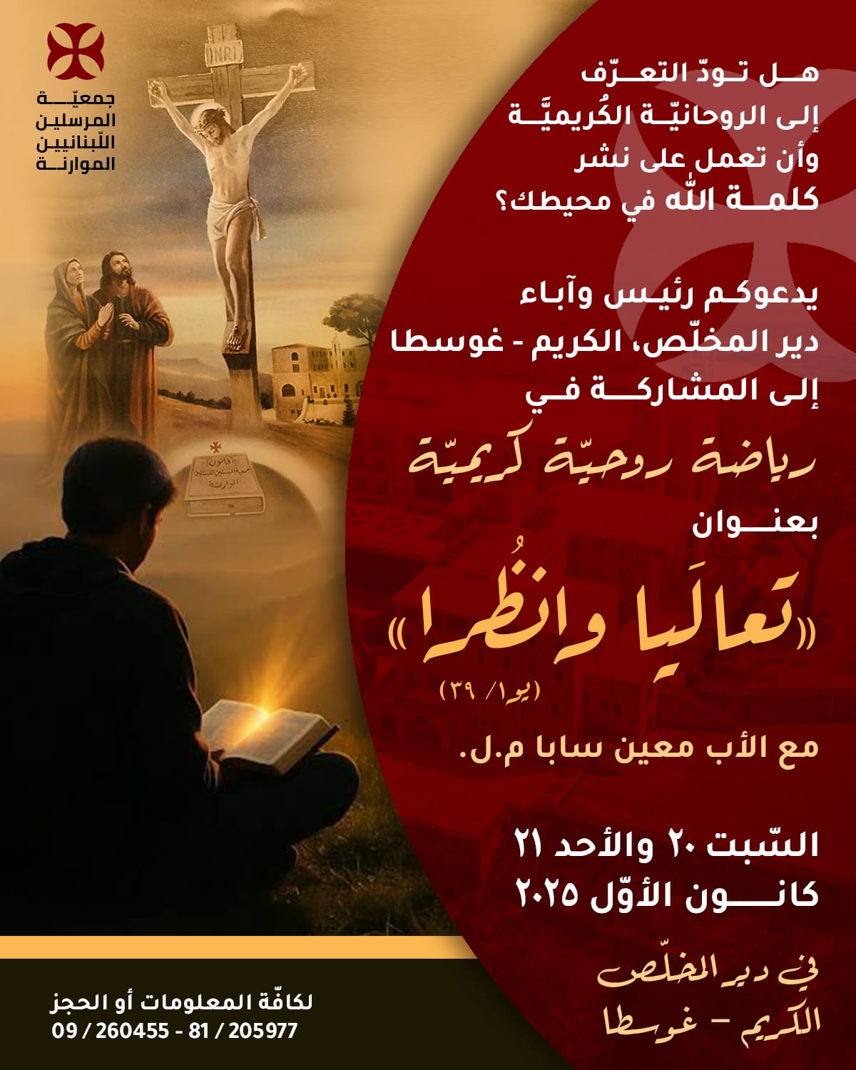 يدعوكم رئيس وآباء دير المخلّص، الكُرَيم – غوسطا، إلى المشاركة في رياضة روحية كُريميّة بعنوان "تَعالَيا وانظُرا" مع الأب معين سابا المرسل اللبناني، للتعرّف إلى الروحانية الكُريميّة والعمل على نشر كلمة الله في المحيط.